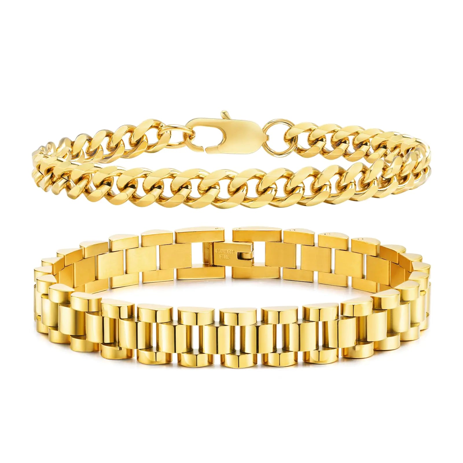 VNOX 2 PCS Gold Bracelets for Men Jewelry-Minimalist Womens Mens Gold Plated Stainless Steel Solid Cuban Link Chain Bracelet Bracelet Set Wrist Band Gifts for Him Boyfriend Dad7.5 Inches